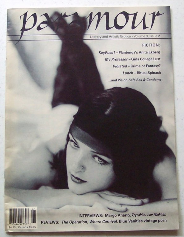 And one way in which the romance-fiction magazine were still furthering their art was in not shying away from sex in romance...something the following erotic fiction magazines also had no problem with...Evergreen Review having been one of the first of the high-profile magazines to challenge bluenoses, particularly in the blue uniforms of the US Post Office, from its first years of publication in the 1950s...something that Eros would also attempt less successfully in the early '60s. Among the latter-day entries of the '80s and '90s,Yellow Silk might've been the most artistically ambitious, Blue Blood the most youth-oriented and Gothic-focused, Nerve the most nervous about its ultimate goals (resembling, as it did, the quickly-failed Future Sex of a half-decade before; Nerve's print edition was also shortlived) while Libido tried to be the most lighthearted. Paramour was, by me, simply the most consistently erotic. (And, among magazines not primarily devoted to fiction, the young women's magazine Bust is the only extant, consistent newsstand source of erotic fiction with which I'm familiar...with their "One-Handed Reads" in nearly every issue...)