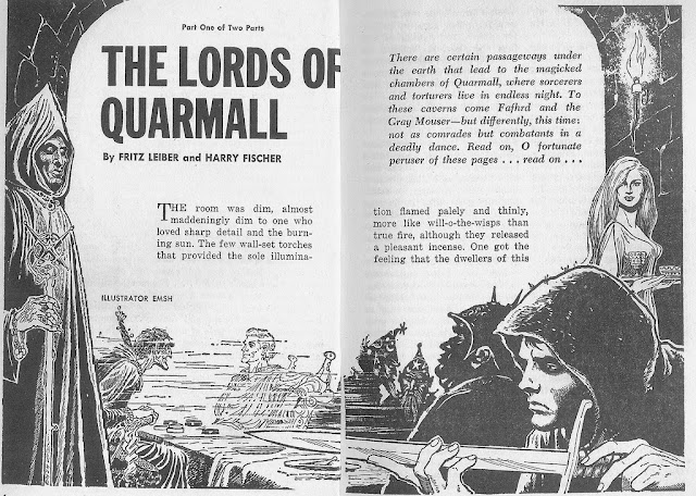 Wallace West is next up in the MOH, with "A Thing of Beauty," a Weird Tales reject that presumably sat in a drawer for three decades, and perhaps deservedly, though it's certainly a better story than the Long; a hunchbacked functionary at a medical school becomes obsessed with the corpse of a young woman, a suicide-by-gas, one of those he's charged with preserving for purposes of med student dissection. His rhapsodies over her nude form allow West to have him recite no little Romantic poetry, the caretaker's other obsession. WT editor Farnsworth Wright supposedly rejected the story as too distasteful, though its frankness is one of its few strengths. In the Gamma issue, Fritz Leiber's "Crimes Against Passion" is a playlet, one of his surprisingly few explorations of that form (given his theatrical background and love of the work of Shakespeare and John Webster, among others). It's also an excuse to rummage about mostly in Shakespeare's plays and to a lesser extent those of Aeschylus, while making easy jokes at the expense of modern psychiatry...this piece is one of the weaker Leiber fictions I've read, and feels like the kind of thing that instead would've gone to one of the more literate fanzines normally. Leiber is a better artist than West, but neither is swinging for the fences in these, even given the indulgence in hat-tipping to their literary favorites. The West isn' t horror fiction or at least is non-fantasticated; the Leiber is so much a stage jape or sketch that it barely registers as fantasy.